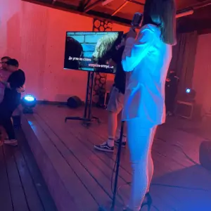 Для того что бы установить зону караоке не нужно много, всего лишь подключение к электричеству, желательно закрытое помещение, свободного места 3 на 3 метра и несколько желающих спеть свои заветные песни, а учитывая наш опыт через пару минут желающих становится уже в несколько раз больше.
