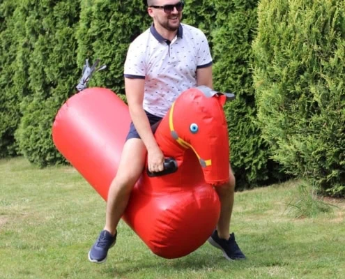 Любите верховую езду? — Тогда вам точно придется по нраву эстафетный аттракцион «Скачки»! С ним вы сможете галопом прокатиться по зеленой травке, однако за скорость галопа отвечаете только вы! Садитесь на надувного коня и вперед к победе!