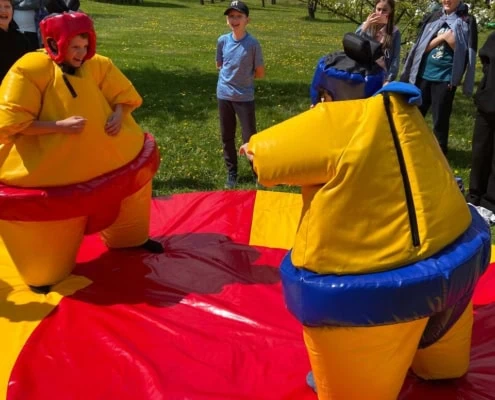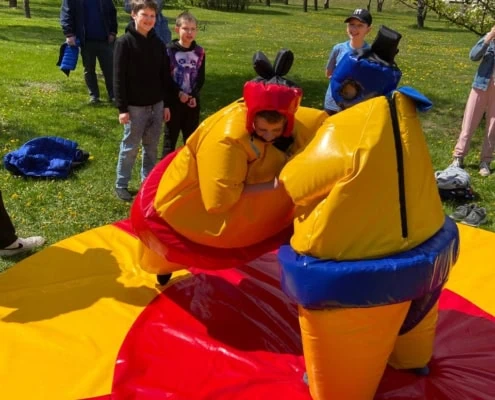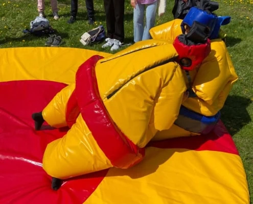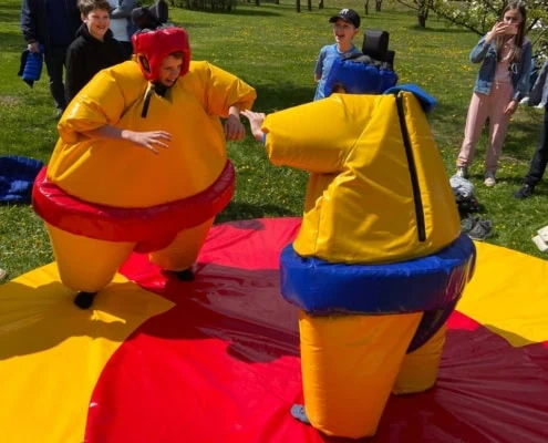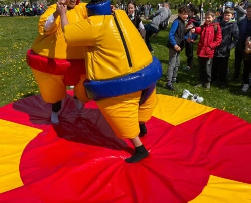Планируете устроить соревнование на силу? Аттракцион «Сумобой» — лучший способ померяться силами в мастерстве сумо! Надувные костюмы надежно защитят вас от нападения соперника, а мягкий татами от самостоятельного падения.