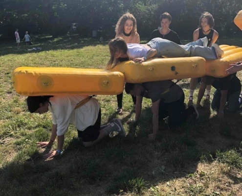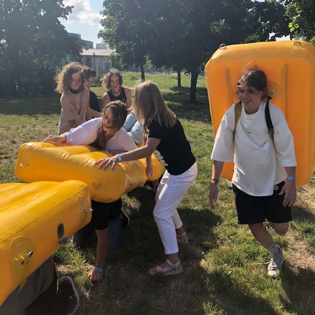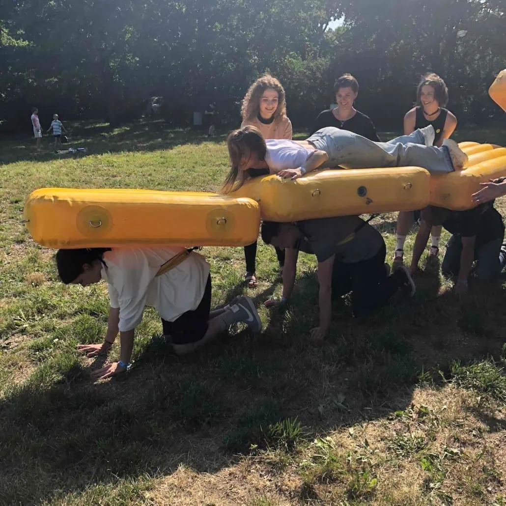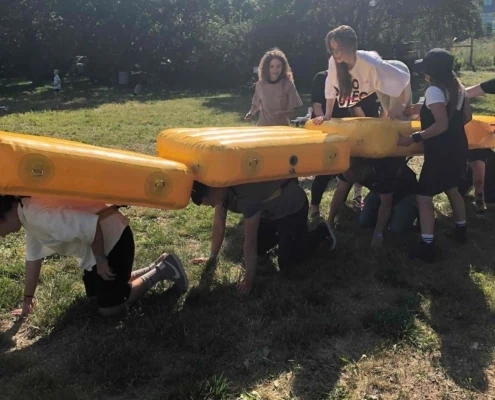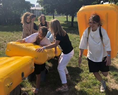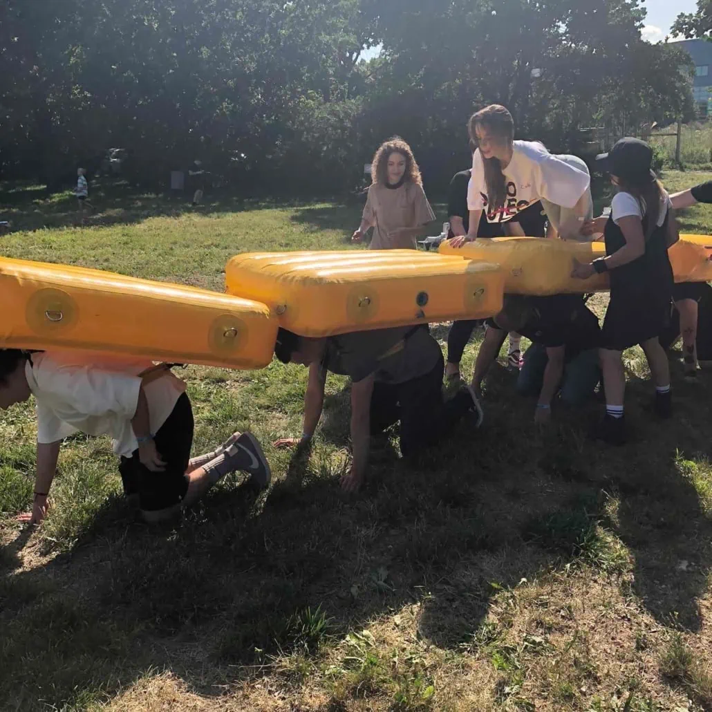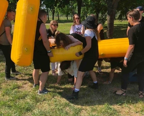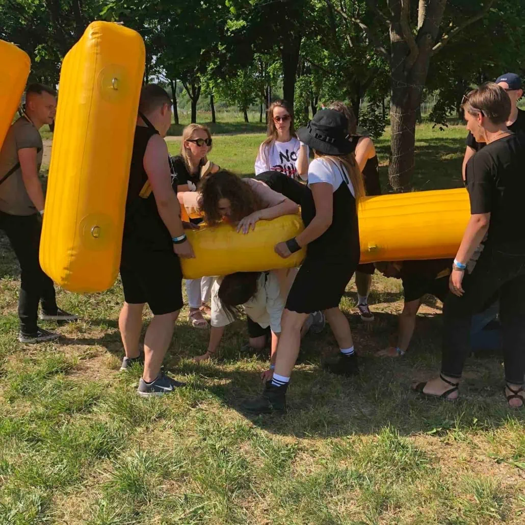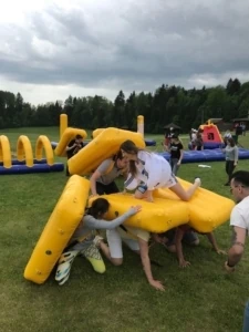 Задача участников: Команде предстоит переправиться через определенное расстояние. Капитан каждой команды должен выбрать, кто из участников надевает мягкую надувную подушку, а кто переправляется по вверху.