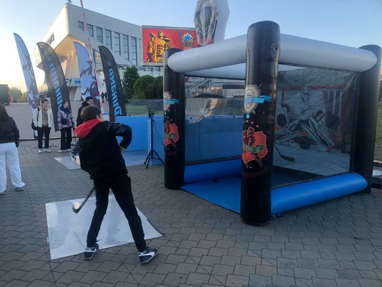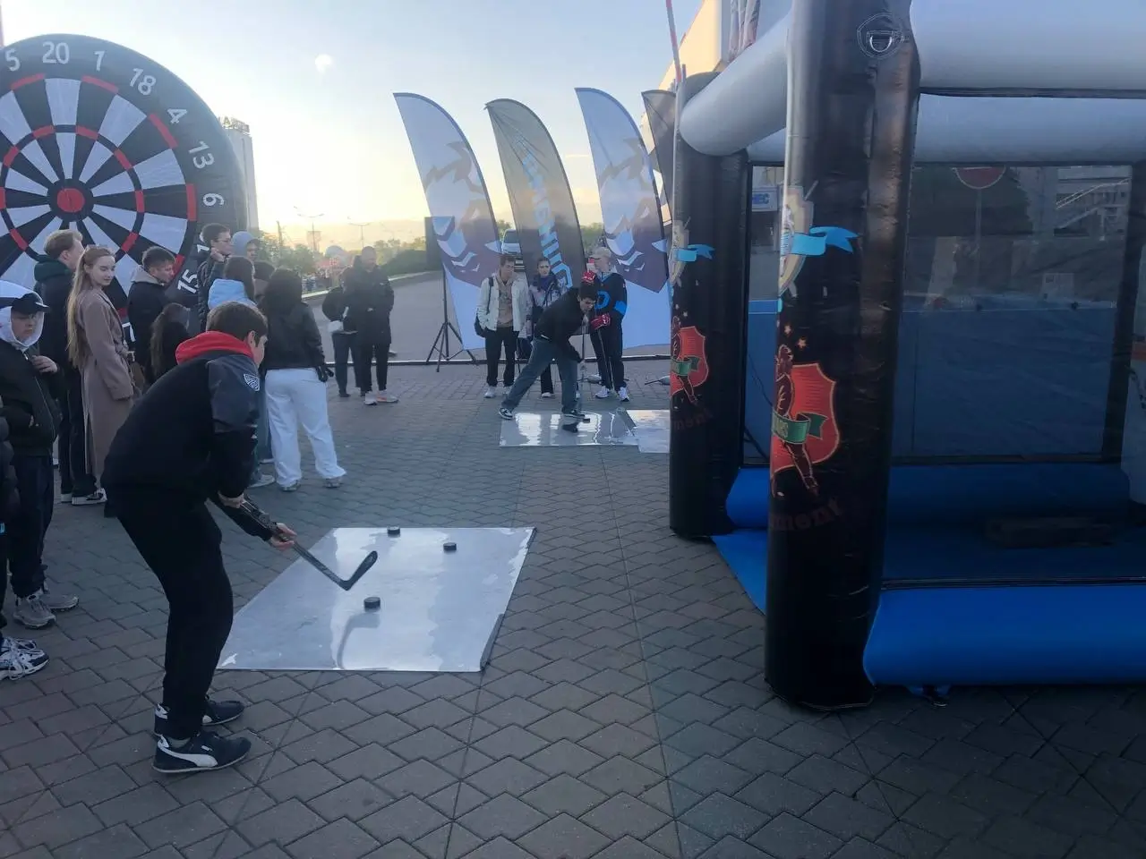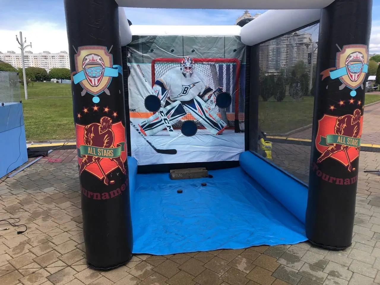 Меткая шайба в аренду и прокат в Минске и по Беларуси. Надувной хоккейный аттракцион, где участники бьют клюшкой по шайбе и попадают в отверстия для набора очков.