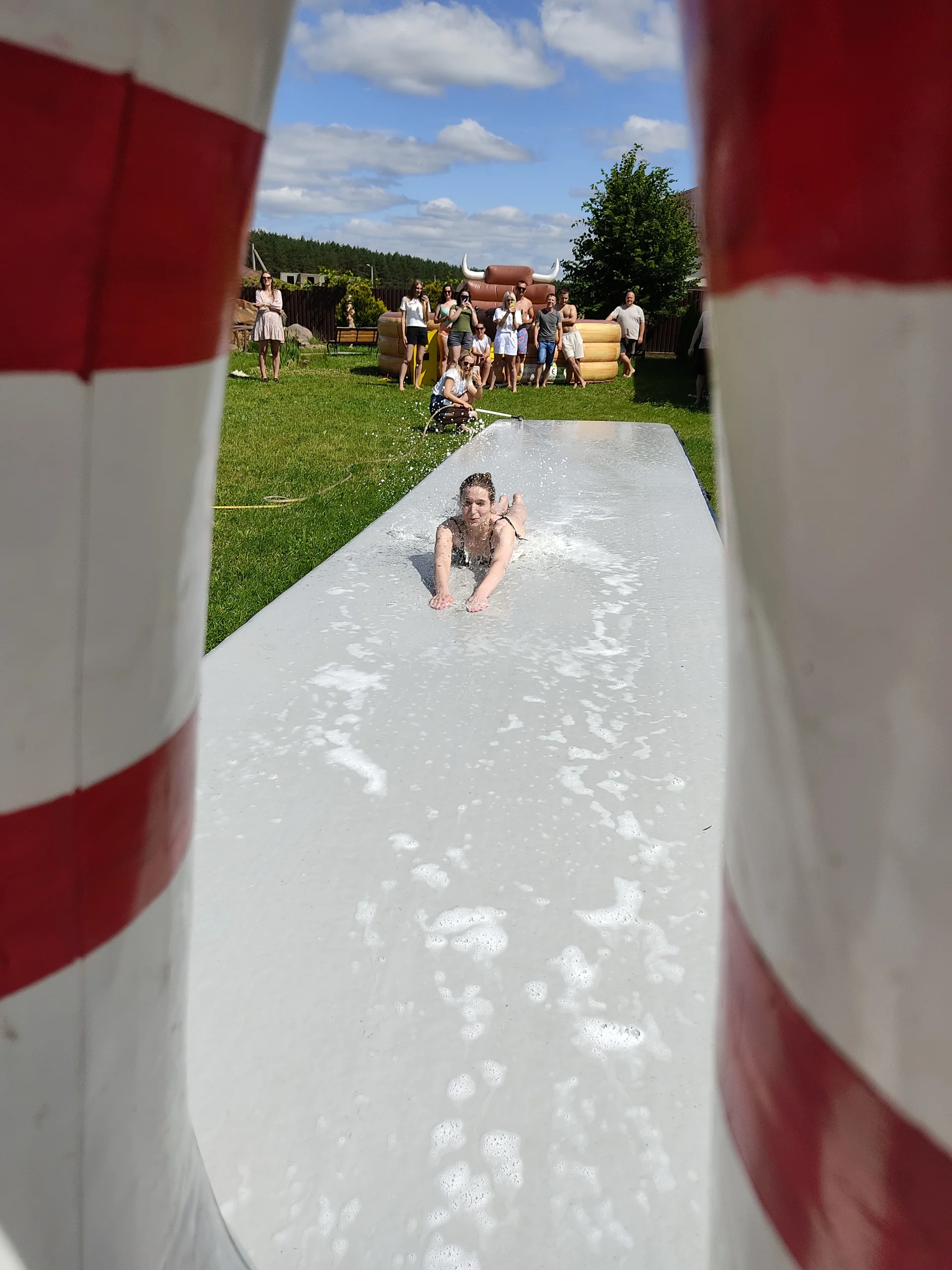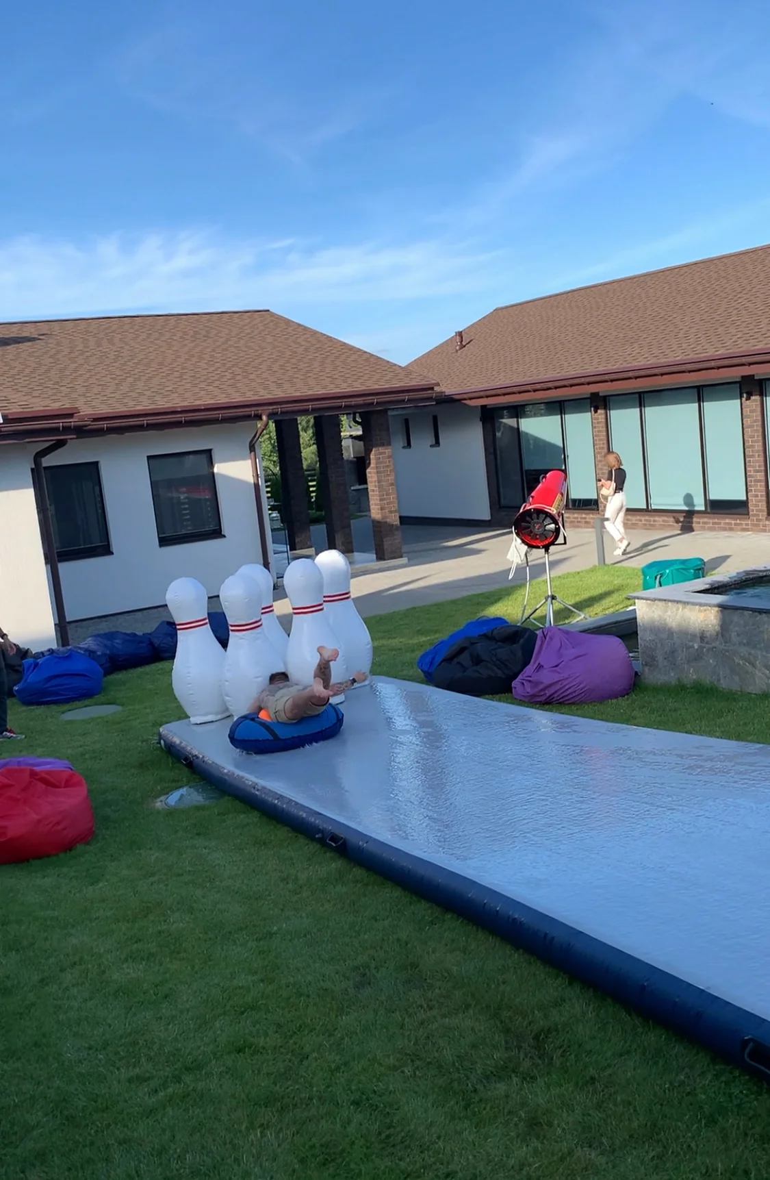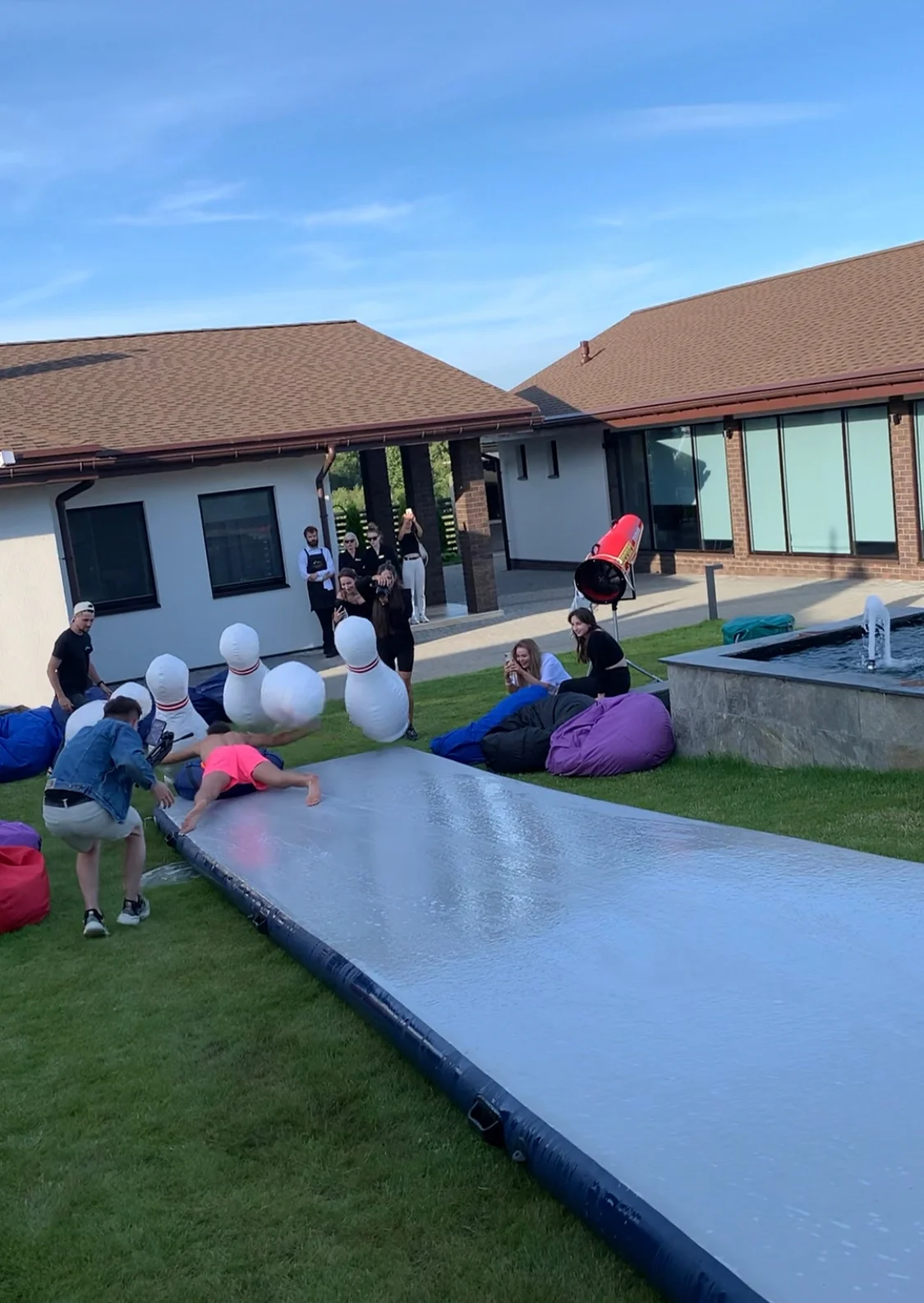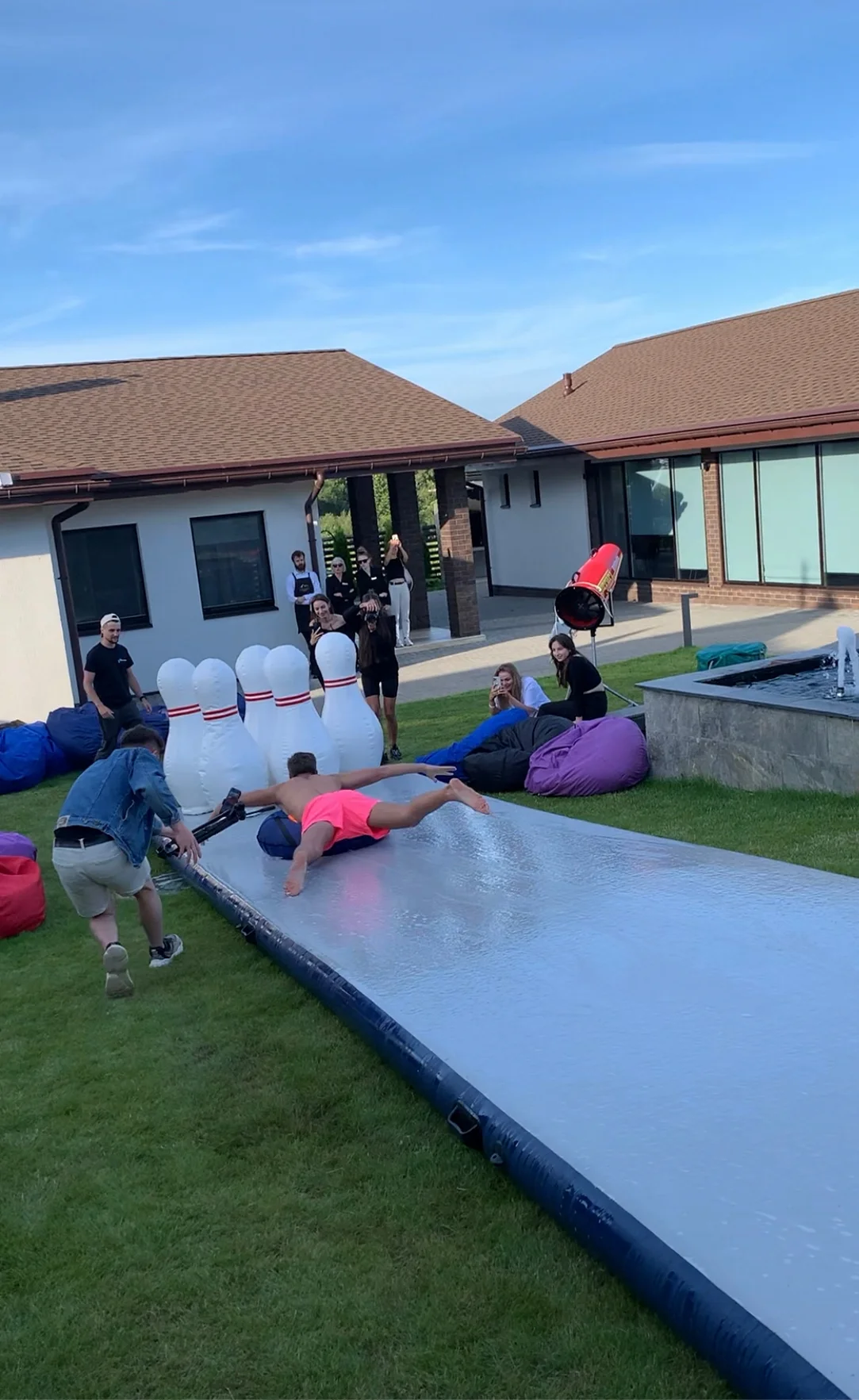Боулинг людьми в аренду и прокат в Минске и по Беларуси. Мыльная гимнастическая дорожка 12 метров, вода и гигантские кегли — зрелищный летний аттракцион для мероприятий.