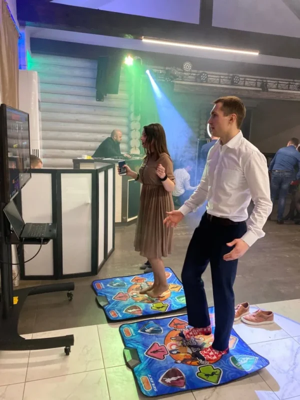 Караоке для ног в аренду — это активный танцевальный аттракцион для мероприятий, построенный на формате танцевальных платформ Dance Dance Revolution. Участники становятся на специальные платформы и нажимают ногами на стрелки в такт музыке, повторяя движения и зарабатывая очки за точность и ритм. Формат максимально динамичный, зрелищный и сразу создаёт атмосферу драйва и веселья.