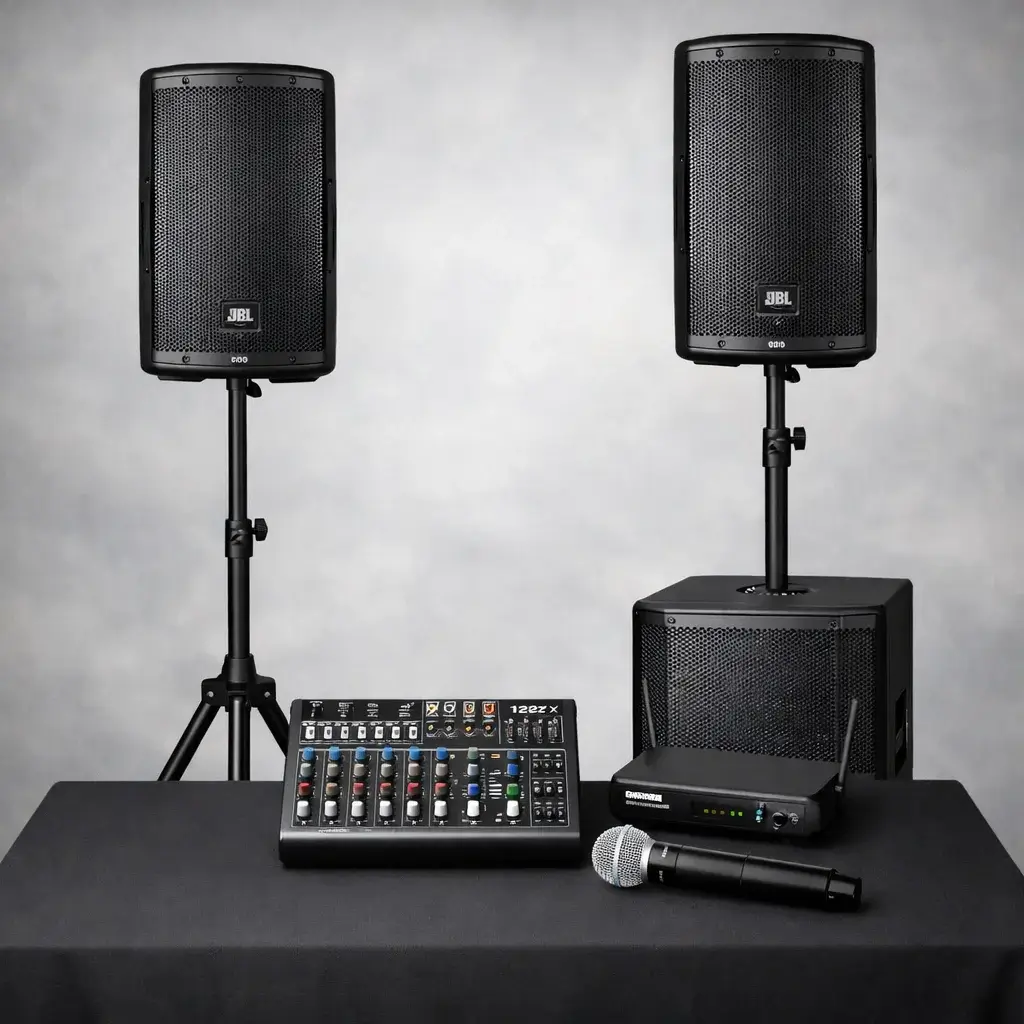 Комплект звука №3 в аренду в Минске и по Беларуси. Колонки JBL, сабвуфер, микшер и микрофон для мощного звука на мероприятиях.