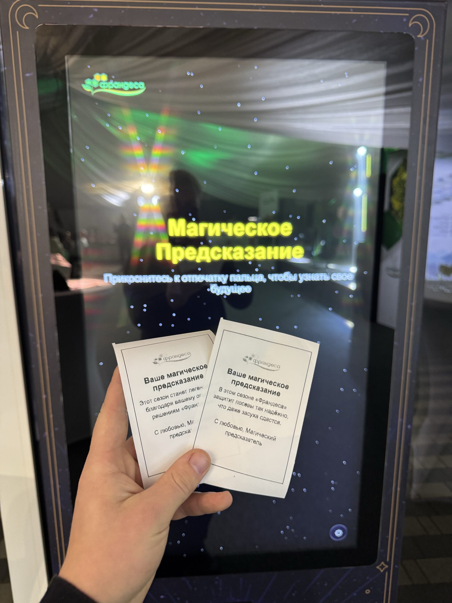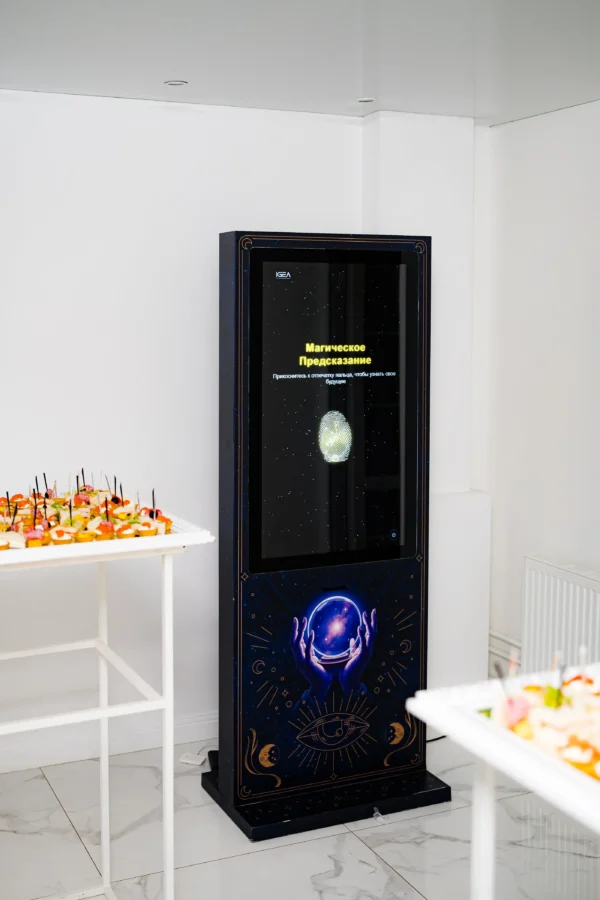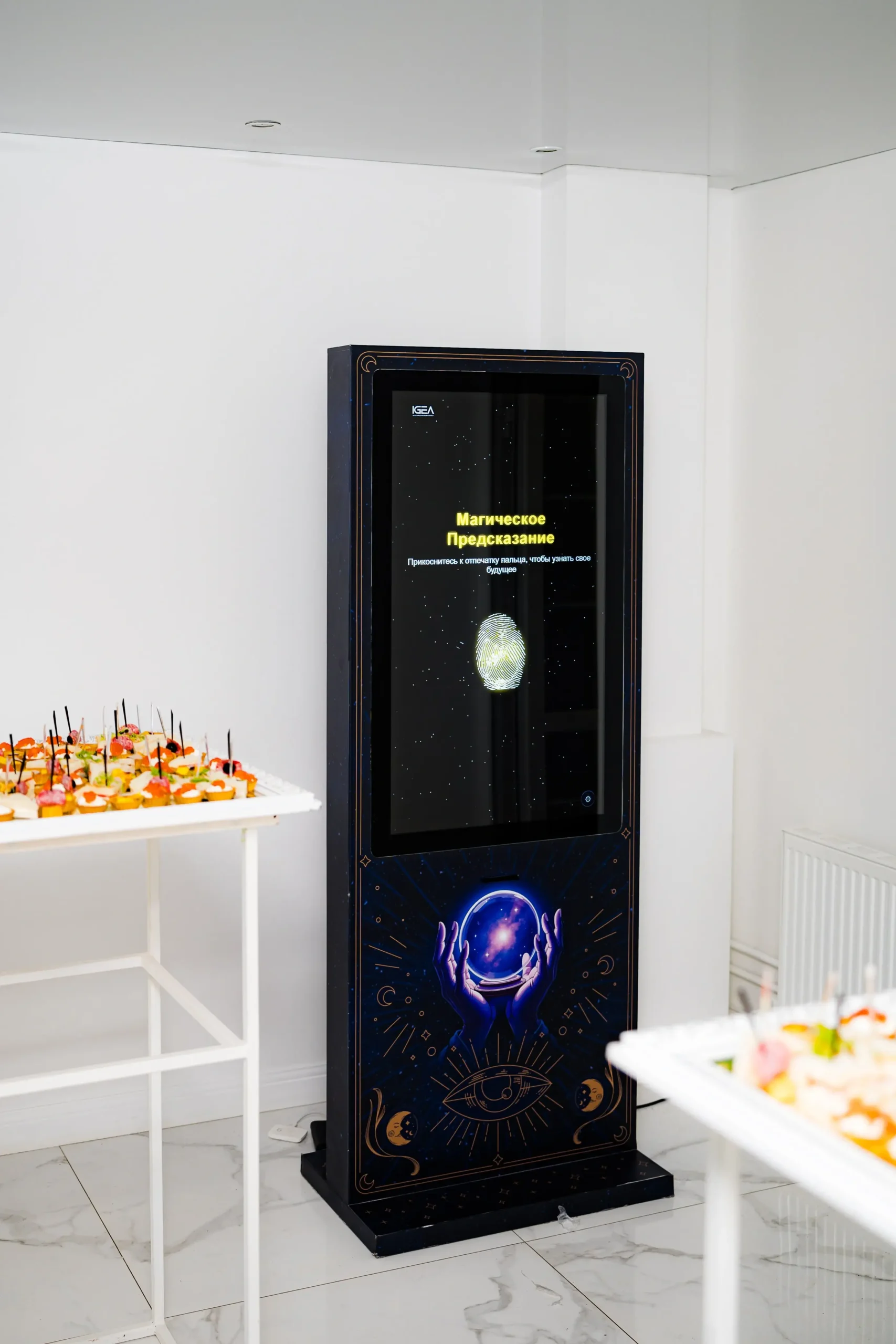 Магический предсказатель в аренду — это атмосферный интерактивный аттракцион для мероприятий, который сочетает магию, технологии и эффект неожиданности. Гость подходит к стойке, касается экрана, после чего магический предсказатель печатает персональное послание. Предсказание можно забрать с собой, что делает опыт не только эмоциональным, но и запоминающимся.