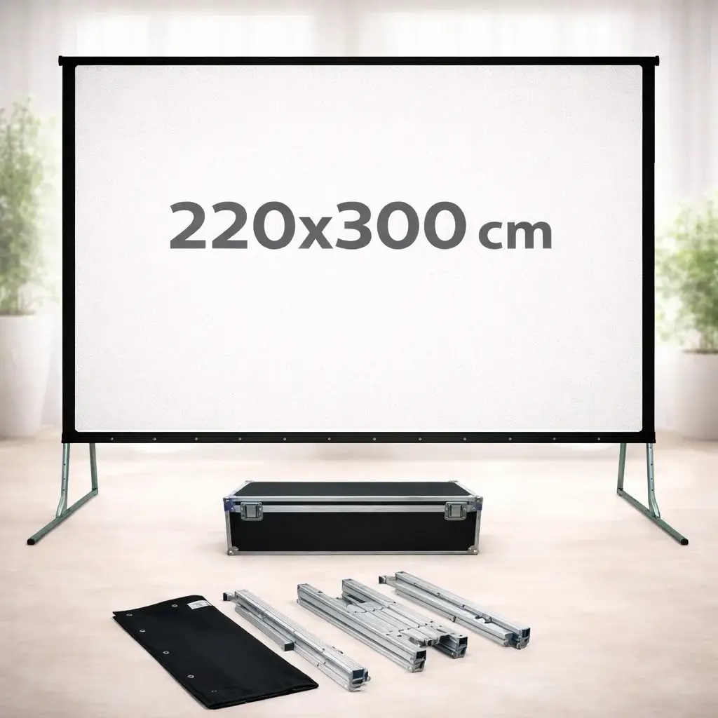 Это каркасный проекционный экран, который собирается непосредственно на площадке. Конструкция обеспечивает идеально ровное полотно и стабильную работу даже при длительном использовании.